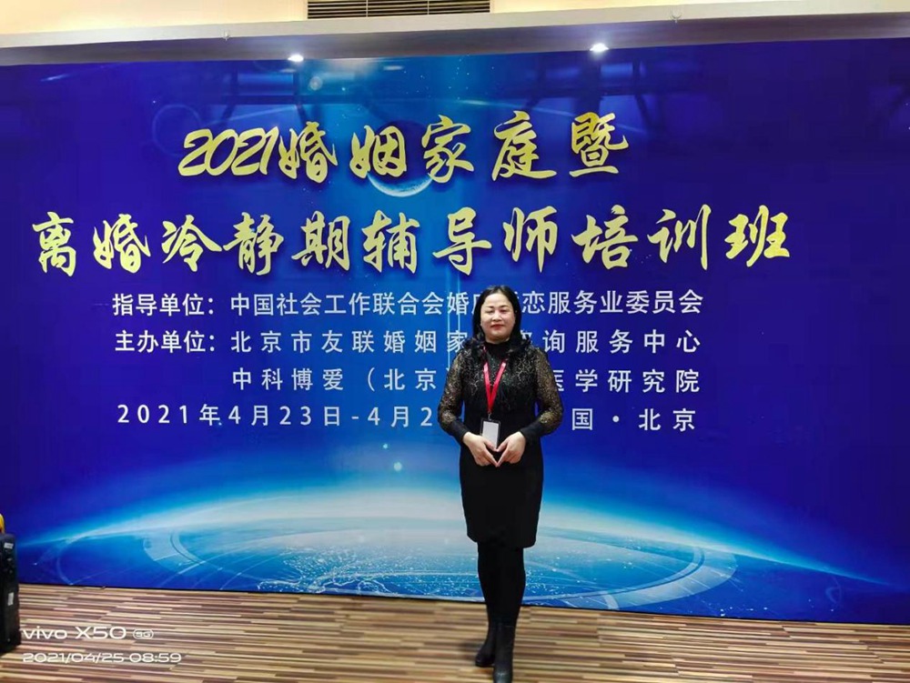 2021年4月23号至4月25号受中国社会工作联合会婚庆婚恋服务业委员会邀请参加“婚姻家庭暨离婚冷静期辅导师” 专业技能培训会议